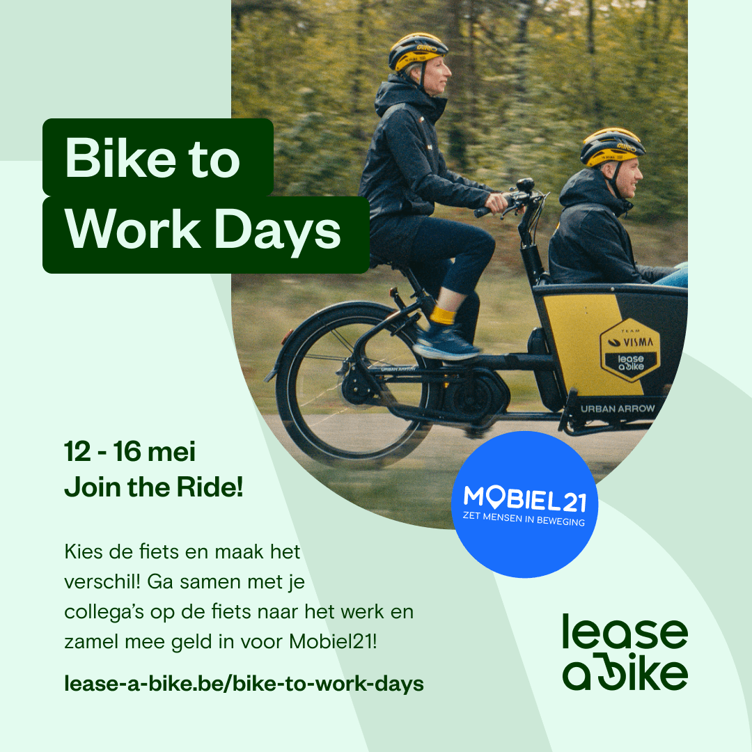 Lease a Bike is vanaf 1 januari 2024 titelsponsor van Team Visma | Lease a Bike. Team Visma | Lease a Bike en Lease a Bike hebben de gedeelde missie om mensen te inspireren om vaker op de fiets te stappen. Om te sporten, naar het werk te gaan en in ons dagelijks leven. Met de Bike To Work Days willen wij vanuit Lease a Bike mensen aanzetten tot gezonder en duurzaam leven en fietsen toegankelijk maken voor nog meer mensen in België en de andere landen waarin wij actief zijn.